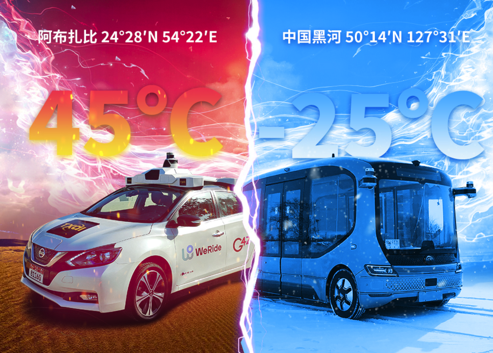 -25℃的我国黑河和45℃的阿布扎比,位处地球上极冷和极热的当地,文远知行的Robobus和Robotaxi成功完成了极点气候环境下的自动驾驶测验。