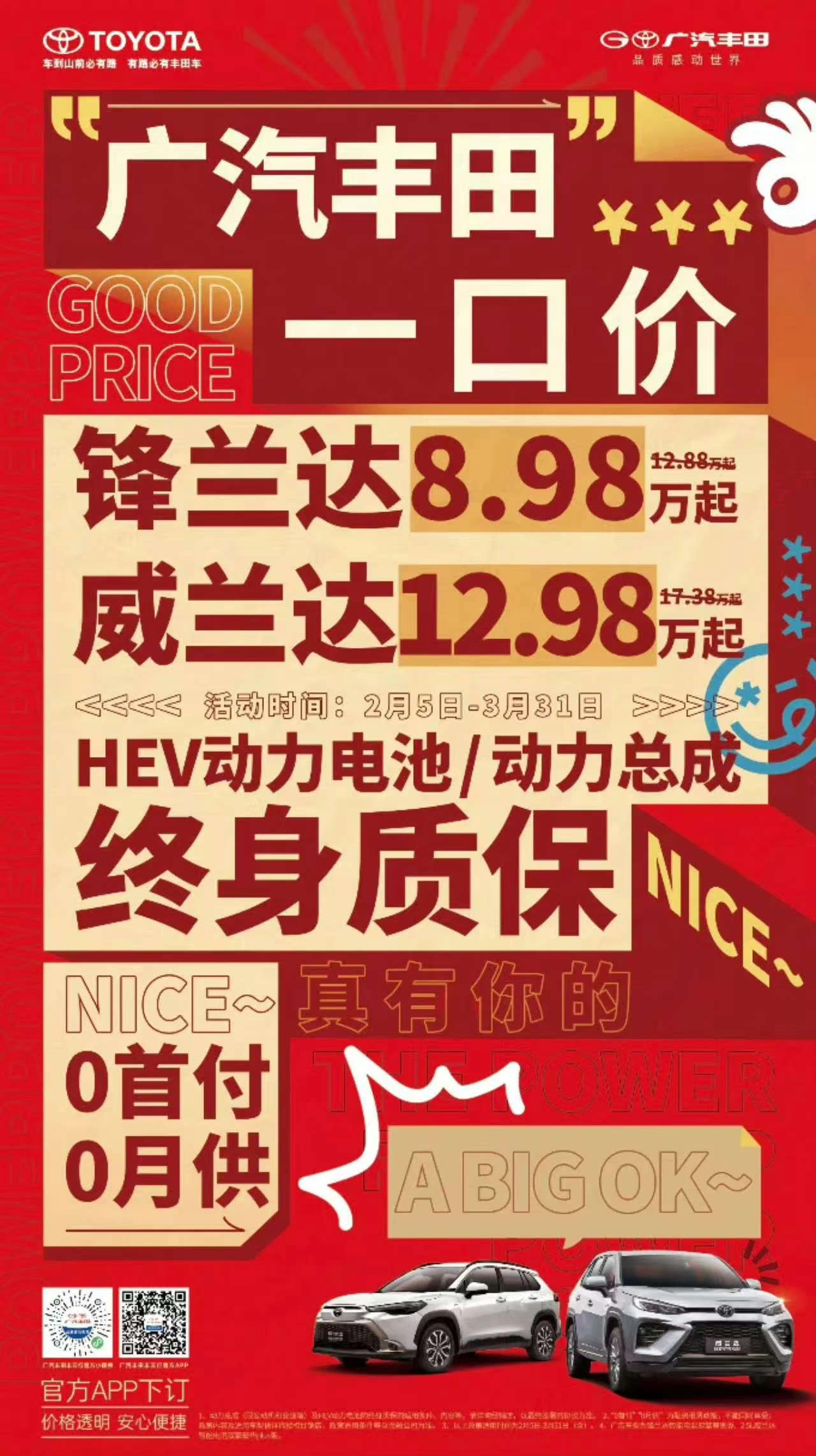 广汽丰田也针对旗下的锋兰达和威兰达两款SUV推出“一口价”优惠政策,并许诺三大中心零部件终身质保。