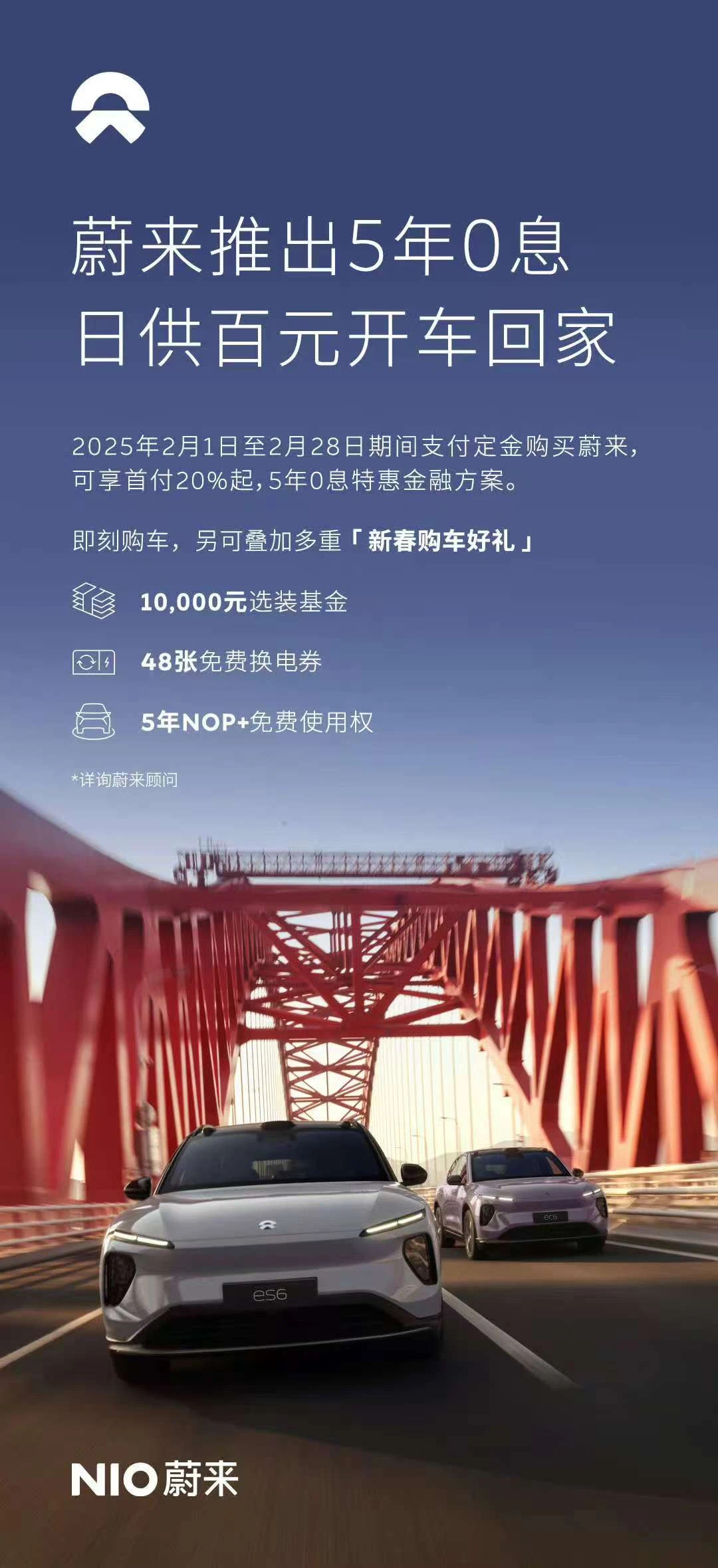 蔚来轿车推出5年零息计划,首付低至20%,手续费全免,并且还搭配了其他的购车优惠等。